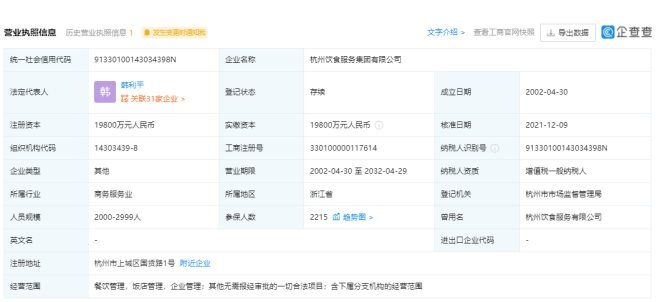 資料顯示,杭州飲食服務(wù)集團有限公司成立于2002年,法定代表人為韓利平,注冊資本1.98億元人民幣,經(jīng)營范圍包含:餐飲管理,飯店管理,企業(yè)管理等。據(jù)悉,杭州飲食服務(wù)集團有限公司100%控股知味觀食品有限公司、杭州知味觀食品有限公司、杭州知味觀味莊餐飲有限公司、浙江天香樓大酒店有限公司等,擁有知味觀品牌。