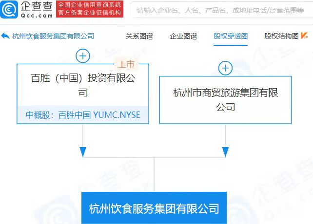 發(fā)生此次工商變更之后,杭州飲食服務(wù)集團有限公司由百勝(中國)投資有限公司、杭州市商貿(mào)旅游集團有限公司共同持股,雙方持股比例不詳。