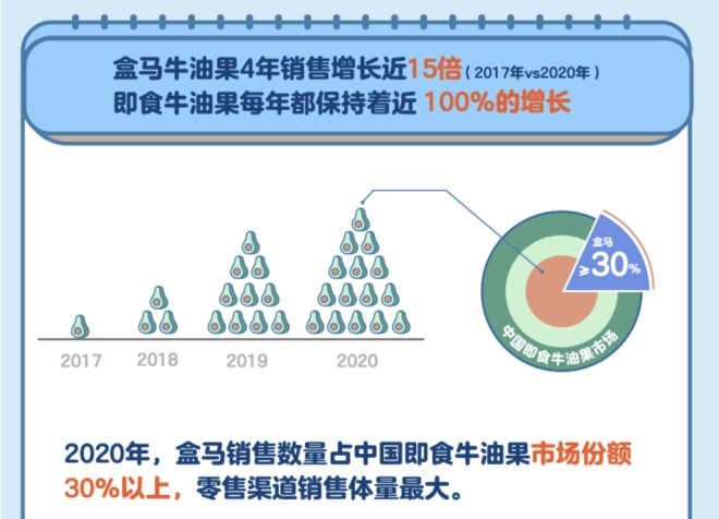被譽(yù)為“森林黃油”的牛油果,曾被視為“中產(chǎn)小資”的專(zhuān)屬。不會(huì)挑、不會(huì)吃,導(dǎo)致它的市場(chǎng)接受度不高。盒馬從2018年全面上架即食牛油果,讓用戶(hù)買(mǎi)到熟度剛剛好、可以直接吃的果實(shí),銷(xiāo)量逐年增長(zhǎng)。