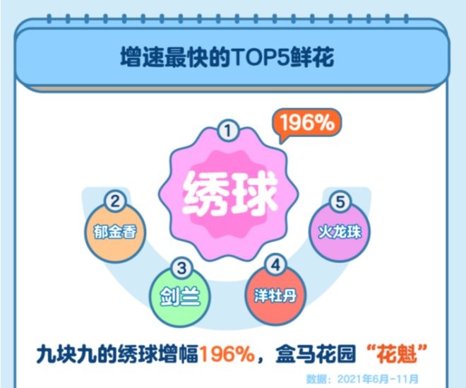 《報(bào)告》顯示,洛神玫瑰、針墊花、重瓣百合、大花蕙蘭等小眾和進(jìn)口花材,逐漸被大眾所接受,成為“新晉網(wǎng)紅”。今年被盒馬帶火的云南重瓣繡球,更是一躍成為盒馬花園的當(dāng)家“花魁”。