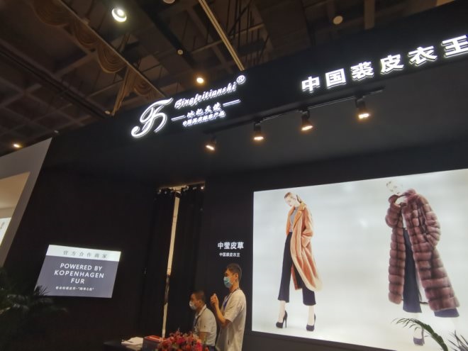 在“海寧中國國際時裝周”現(xiàn)場,皮草商家搭建的品牌展位