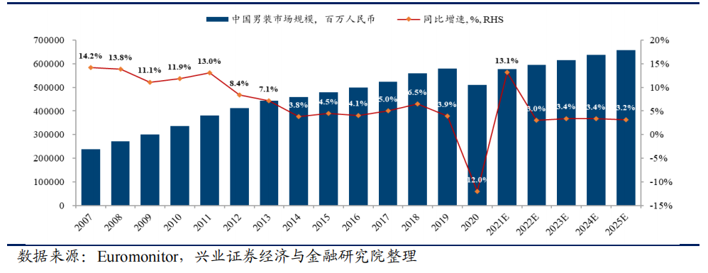 據(jù)興業(yè)證券研報統(tǒng)計,2020 年受疫情沖擊,男裝市場規(guī)模大幅萎縮至5108億元,同比下降 12%。