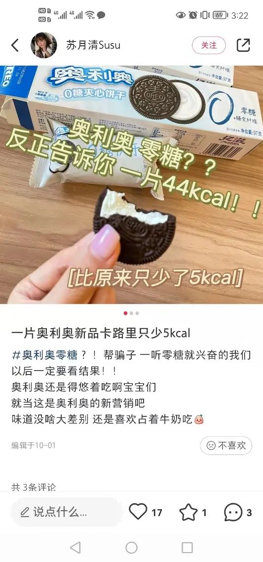 還有升級(jí)后的“0糖”版奧利奧,有小紅書(shū)博主吐槽,配方還是曾經(jīng)的配方,雖然少了糖,但熱量還是很高,新款只比原來(lái)少了5kcal,口感吃起來(lái)還是很甜。即使沒(méi)糖,也沒(méi)讓奧利奧變得更為健康。