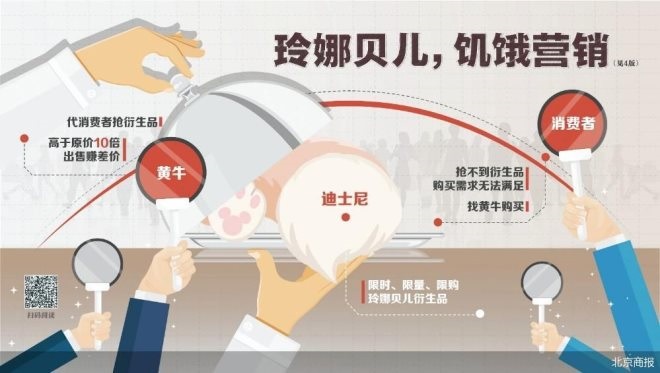 業(yè)內(nèi)人士將迪士尼的這種銷售方式稱為“饑餓營(yíng)銷”,即“商品提供者有意調(diào)低產(chǎn)量,制造出一種供不應(yīng)求的假象,以維護(hù)品牌形象,并維持商品的較高售價(jià)和利潤(rùn)率”!罢且?yàn)樘喙竞托袠I(yè)進(jìn)行饑餓營(yíng)銷,使得供不應(yīng)求的假象出現(xiàn),黃牛才有了市場(chǎng)。他們通過各種方式替消費(fèi)者購(gòu)買,再以高價(jià)銷售賺取差價(jià)!必(cái)經(jīng)評(píng)論員張雪峰直言。