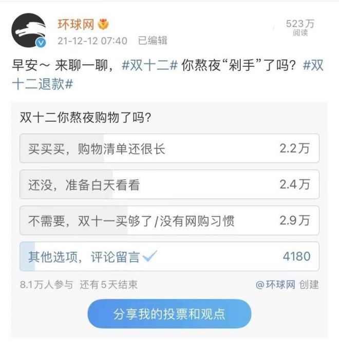 此外,距離雙十一大促也才過去一個月,許多消費者的消費需求還沒能再次激發(fā)。環(huán)球網(wǎng)發(fā)布的“雙十二你熬夜剁手了嗎?”的投票顯示,大約有37%的網(wǎng)友表示“不需要,雙十一買夠了/沒有網(wǎng)購習慣”,還有30%的網(wǎng)友表示,還沒買,準備白天再關注下。