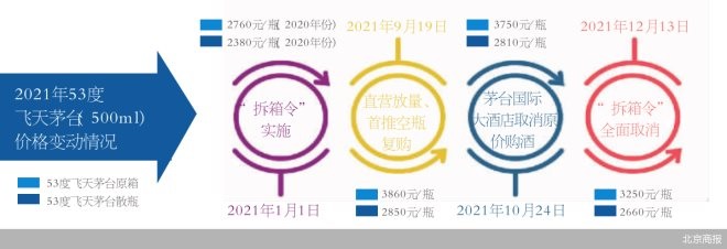 據(jù)了解,推出“拆箱令”原是為了穩(wěn)定終端市場價(jià)格,推動(dòng)終端市場飛天茅臺(tái)的開瓶率。但是,數(shù)據(jù)顯示,在施行“拆箱令”之初,2021年1月1日,2020年53度飛天茅臺(tái)(500ml)原箱終端市場價(jià)格為2760元/瓶,而當(dāng)“拆箱令”正式實(shí)施后,該款飛天茅臺(tái)原箱價(jià)格便一路“高歌猛進(jìn)”,絲毫沒有出現(xiàn)降價(jià)的趨勢,甚至在9月10日達(dá)到3860元/瓶的價(jià)格。
