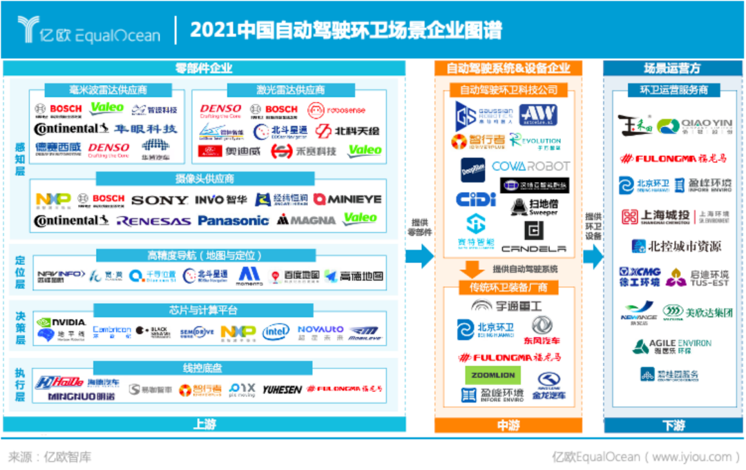 自動(dòng)駕駛環(huán)衛(wèi)場景參與方,按照上下游可以分為零部件企業(yè)、自動(dòng)駕駛系統(tǒng)&設(shè)備企業(yè)和場景運(yùn)營方。其中零部件企業(yè)又包括線控底盤廠商、芯片與計(jì)算平臺廠商、高精度導(dǎo)航廠商、攝像頭供應(yīng)商、毫米波和激光雷達(dá)供應(yīng)商,自動(dòng)駕駛系統(tǒng)&設(shè)備企業(yè)包括自動(dòng)駕駛環(huán)衛(wèi)科技公司和傳統(tǒng)環(huán)衛(wèi)裝備廠商,場景運(yùn)營方包括環(huán)衛(wèi)服務(wù)公司、物業(yè)公司等環(huán)衛(wèi)運(yùn)營服務(wù)商。