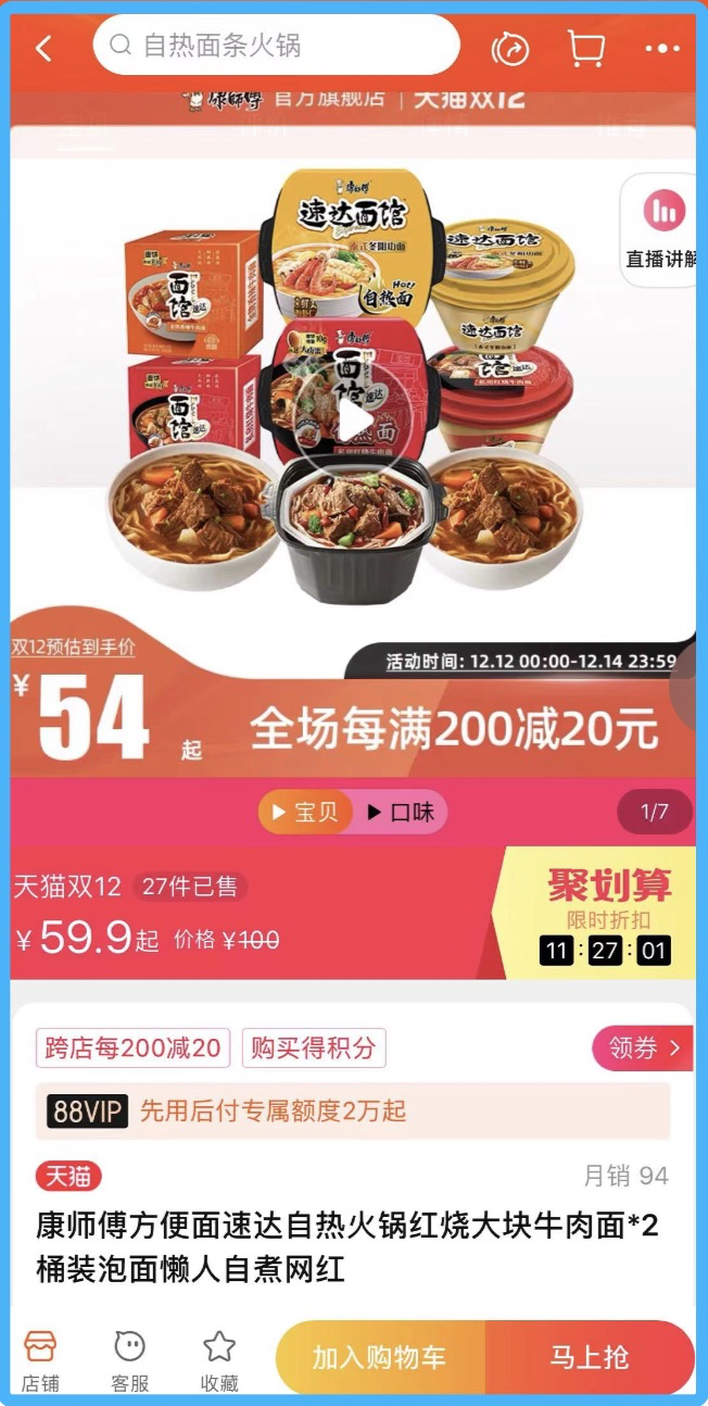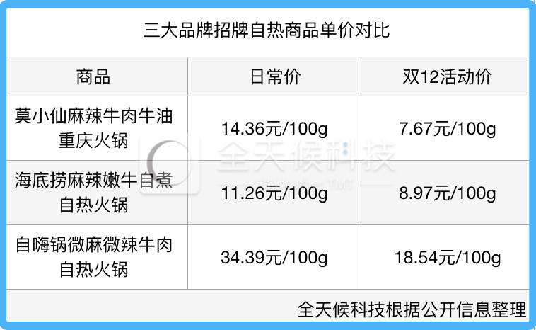 在某電商平臺(tái),這款產(chǎn)品莫小仙390g售價(jià)56元(雙12活動(dòng)價(jià)29.9元),即14.36元/100g(雙12活動(dòng)價(jià):7.67元/100g);海底撈435g售價(jià)49元(雙12活動(dòng)價(jià)39元),即11.26元/100g(雙12活動(dòng)價(jià):8.97元/100g);自嗨鍋171g售價(jià)58.8元(雙12活動(dòng)價(jià)31.8元),即34.39元/100g(雙12活動(dòng)價(jià):18.54元/100g)。