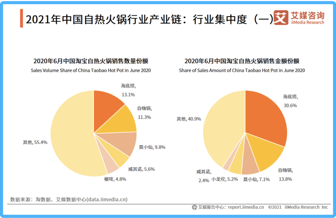 iiMedia Research(艾媒咨詢)數(shù)據(jù)顯示,2020年6月,淘寶前五品牌銷量占比達(dá)44.6%,前五品牌銷售額占比達(dá)59.1%,海底撈、自嗨鍋、莫小仙位居前三;截至2021年10月,中國自熱火鍋企業(yè)數(shù)量達(dá)到78家,相關(guān)企業(yè)注冊(cè)數(shù)量2020年呈爆發(fā)式增長,行業(yè)集中度進(jìn)一步提升。
