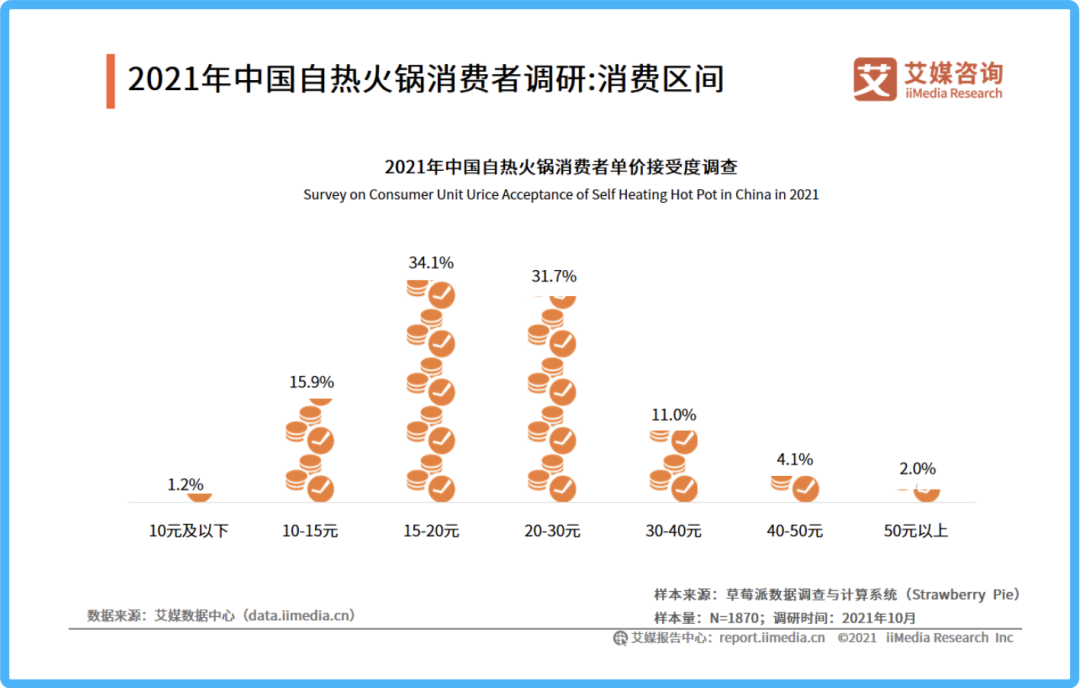 iiMedia Research(艾媒咨詢)調(diào)查顯示,價(jià)格偏高是部分中國消費(fèi)者不選購自熱火鍋的原因,占被調(diào)查用戶的比重超過50%;受訪消費(fèi)者可以接受的自熱火鍋單價(jià)區(qū)間主要集中在15-20元(34.1%),其次是20-30元(31.7%);僅有17.1%的受訪用戶能接受超30元的售價(jià)。