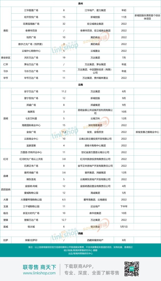 附2022年西南區(qū)域擬開業(yè)商業(yè)項目統(tǒng)計: