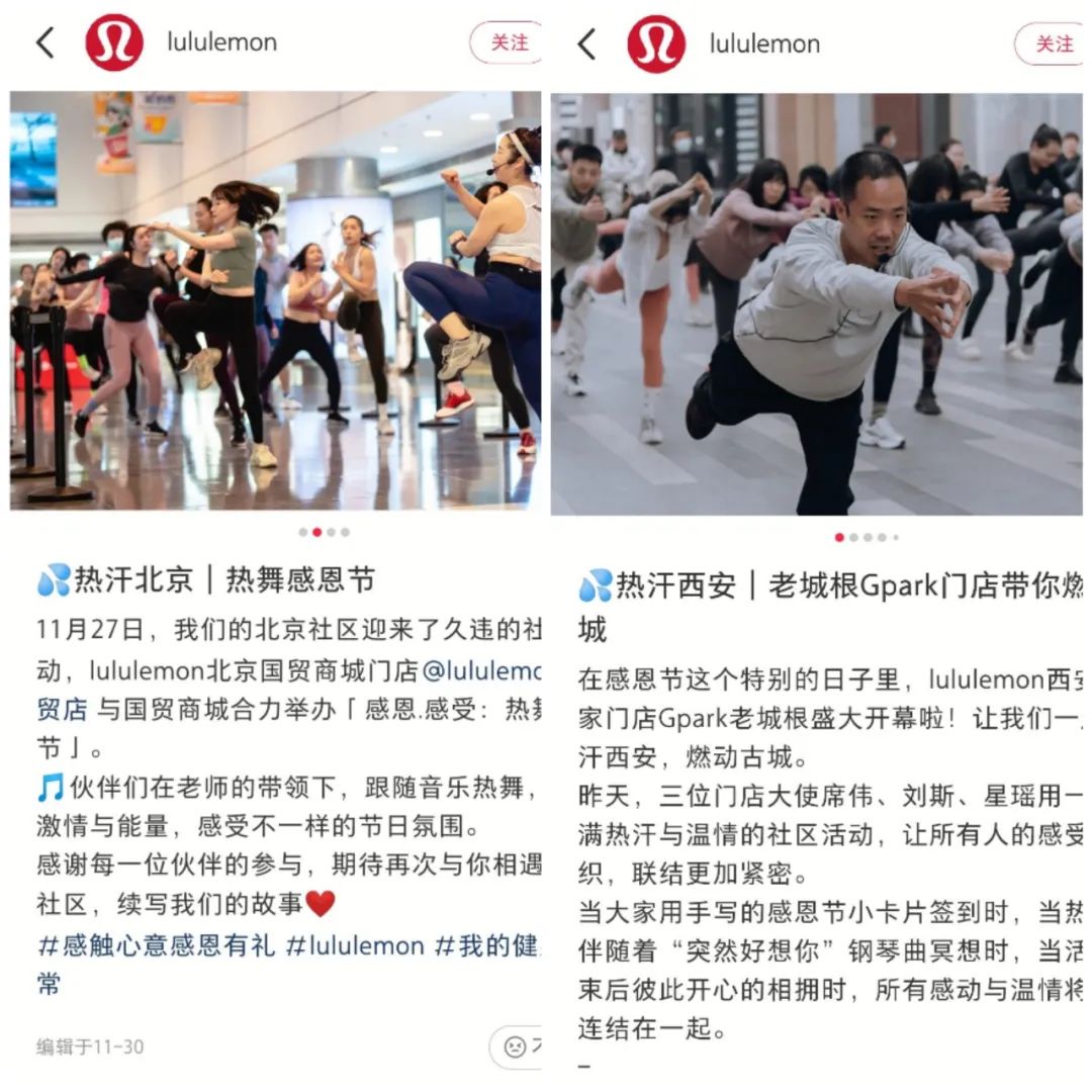 Lululemon與品牌大使合作,通常是以運(yùn)動(dòng)員、瑜伽師、教練等代表的KOL,為他們提供免費(fèi)產(chǎn)品或者折扣,通過(guò)其親身體驗(yàn)進(jìn)行傳播,發(fā)揮“導(dǎo)購(gòu)”的作用進(jìn)行拉新。另外定期舉辦一些冥想、瑜伽等訓(xùn)練課程,還有跑步等戶外運(yùn)動(dòng),維系社群的活躍度。