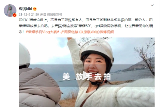 在超高熱度的基礎(chǔ)上,榮耀聯(lián)合天貓大牌日并攜手龔俊,打造全網(wǎng)新青年放手去拍Vlog大賽,并邀請旅游Vlogger房琪、寵物偵探孫錦榮等超過30位知名KOL,共同用榮耀60系列Vlog隔空換鏡記錄生活,展示當代新青年工作與生活,引發(fā)話題討論,以及用戶關(guān)注。大賽在全網(wǎng)收獲億級媒體曝光,視頻累積觀看量超過2000萬,新浪微博#榮耀手機Vlog大賽#話題總閱讀量1.2億,討論量超過10萬,成為時下用戶熱議的活動之一。