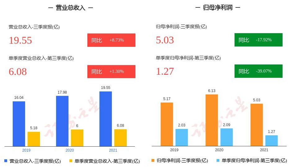 今年以來,涪陵榨菜業(yè)績下滑較為明顯。財(cái)報(bào)顯示,前三季度,公司實(shí)現(xiàn)營收19.55億元,同比增長8.73%,歸母凈利潤5.04億元,同比減少17.92%;基本每股收益0.605元,同比減少22.44%。