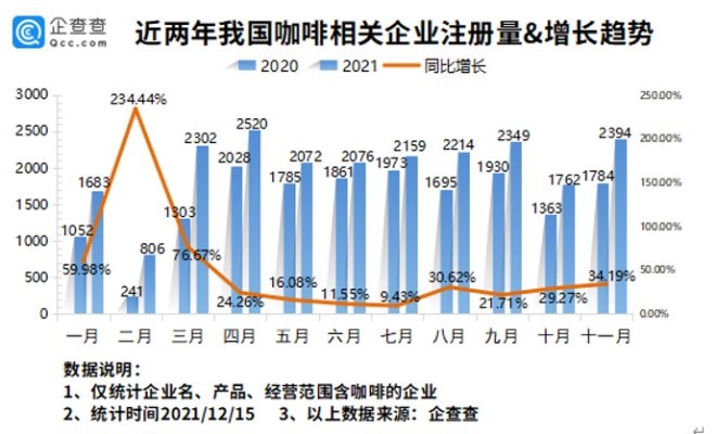 聯(lián)商快訊:企查查數(shù)據(jù)顯示,2021年前11月,我國新增咖啡相關(guān)企業(yè)2.23萬家,同比增長31.28%。