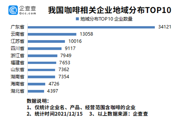 企查查數(shù)據(jù)顯示,從區(qū)域分布來看,廣東以3.41萬家排名第一,云南、江蘇分別有咖啡相關(guān)企業(yè)1.31萬家、1.00萬家,排在第二、三名。此后依次為四川省、浙江省、福建省等。