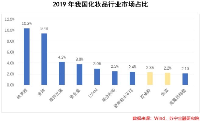 從市場(chǎng)競(jìng)爭(zhēng)格局看,我國(guó)化妝品行業(yè)集中度相對(duì)較低,CR10僅為42.2%,且基本由海外企業(yè)主導(dǎo),尤其是高端化妝品。市場(chǎng)前十大品牌中本土僅占2席,合計(jì)市占率為4.5%。
