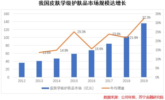 2019年中國(guó)皮膚學(xué)級(jí)護(hù)膚品市場(chǎng)規(guī)模為135.51億元,同比增長(zhǎng)32.3%,2014-2019年復(fù)合增長(zhǎng)率為23.2%,增速遠(yuǎn)高于化妝品行業(yè)整體增速(2014-2019 年 CAGR為9.9%)。隨著大眾對(duì)皮膚健康愈發(fā)重視,藥妝這一細(xì)分領(lǐng)域迎來(lái)了更大的市場(chǎng)。