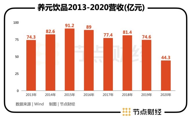 但從2015年后,養(yǎng)元飲品的高成長性戛然而止,并隨之進(jìn)入了下滑通道。2016年-2019年,公司營收分別為89.0億元、77.4億元、81.4億元、74.6億元,緩中有降;2020年,受新冠疫情等多方因素的影響,養(yǎng)元飲品的營收僅達(dá)到44.3億元,相對2019年可以說是接近腰斬。