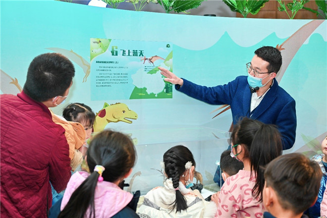 在大進化展區(qū),通過展現(xiàn)九件珍貴展品,結(jié)合科普教育形式,在特展期間每天的不同時間段都會有來自中國古動物館的講解老師講述脊椎動物演化過程的九個重大節(jié)點,既有化石的細節(jié)勾連,又有奇妙故事,科普性和趣味性十足。