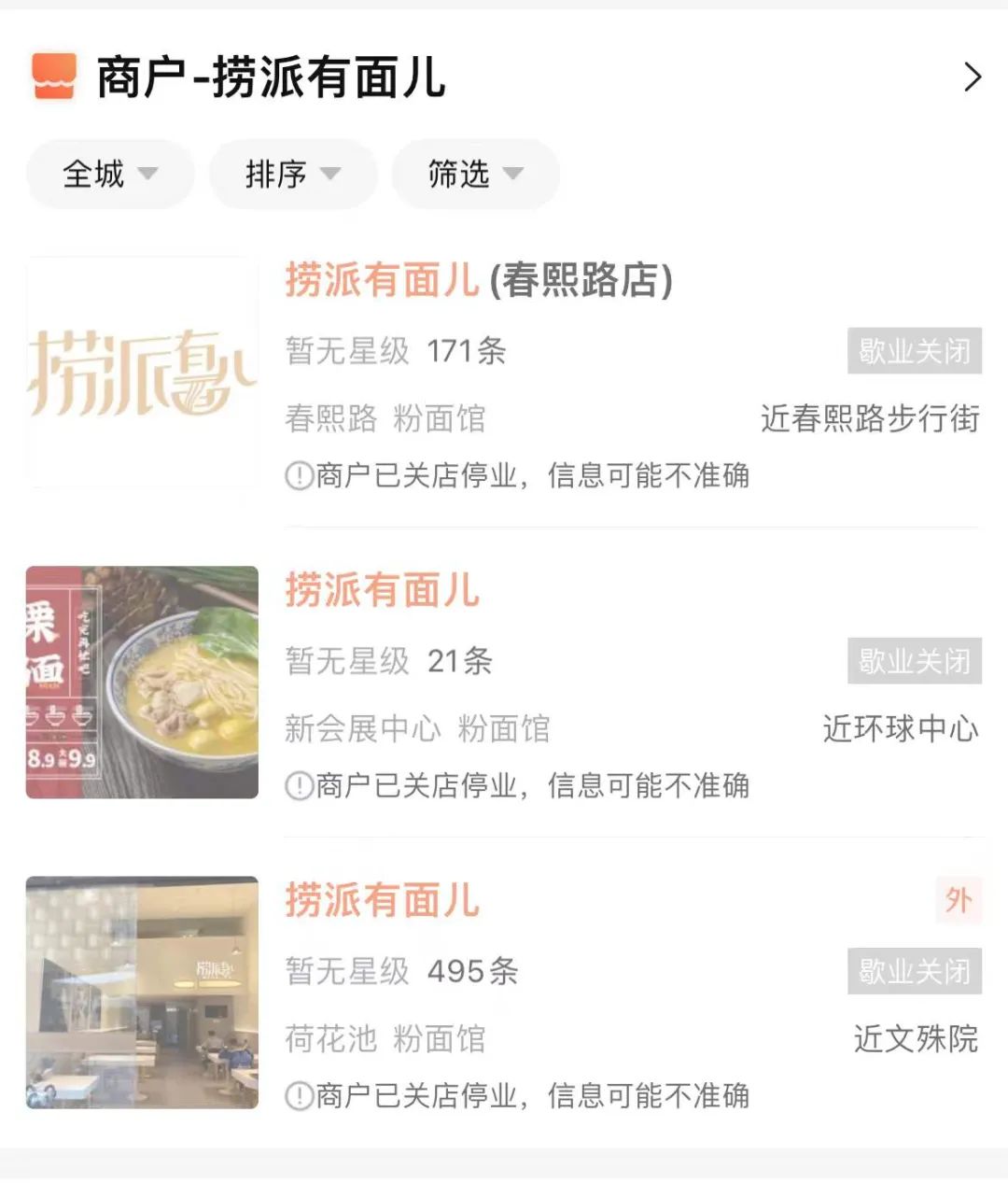 3)成都3家“撈派有面兒”相繼停業(yè)