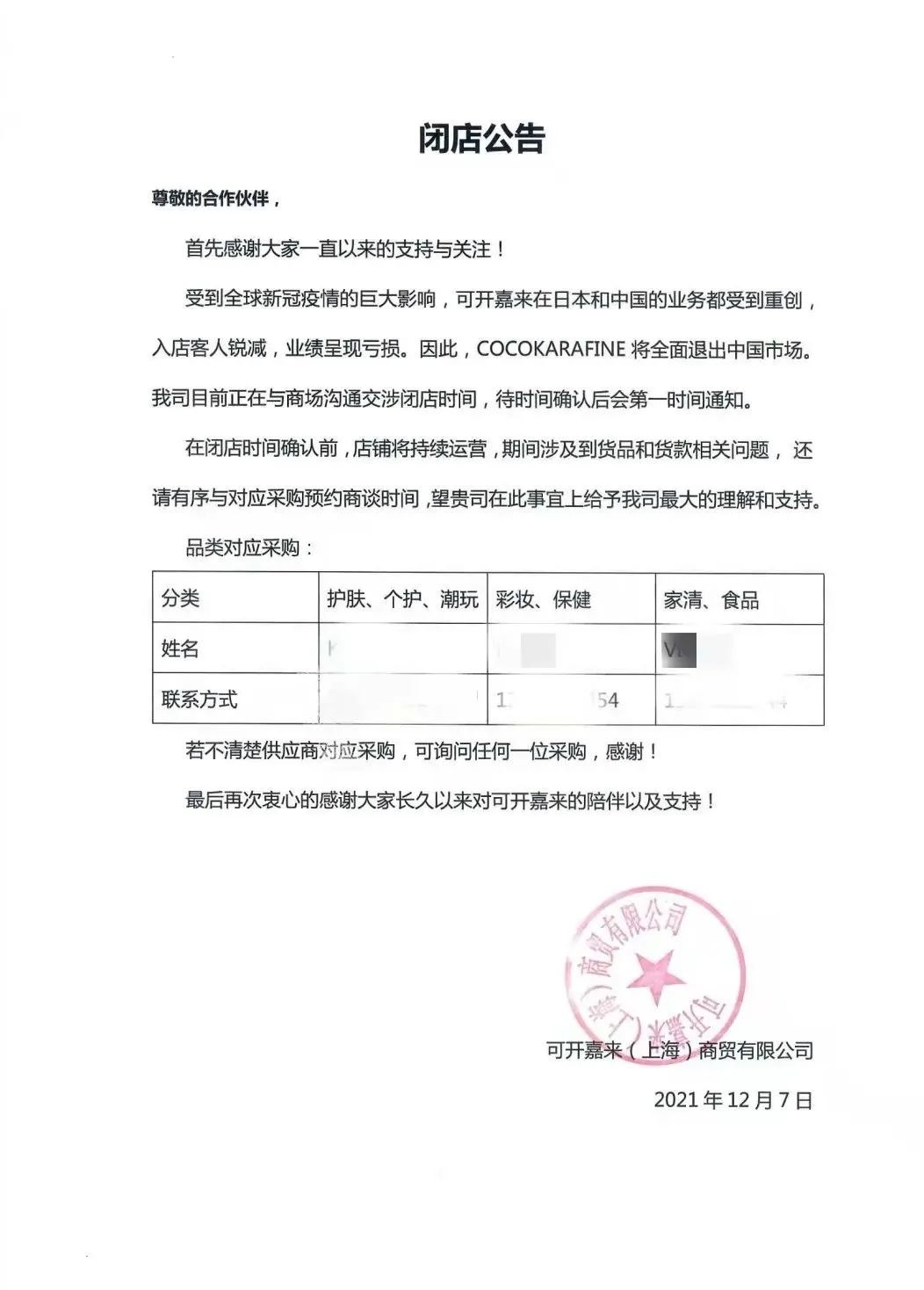 公函顯示,由于受疫情影響,可開嘉來(CocokaraFine)在日本和中國的業(yè)務受重創(chuàng),入店客人銳減,業(yè)績呈現(xiàn)虧損,因此可開嘉來將全面退出中國市場。目前,公司正在與商場溝通閉店時間。