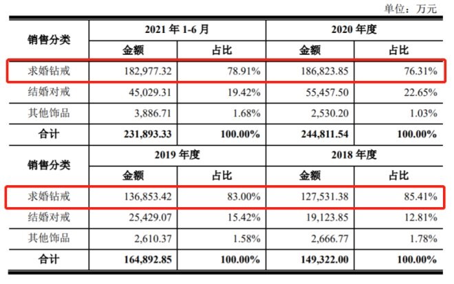 DR鉆戒最鮮明的特征,是宣傳“一生只送一人”的品牌理念,主要產(chǎn)品為求婚鉆戒、結(jié)婚對(duì)戒和其他飾品,其中以求婚鉆戒的單價(jià)與銷售數(shù)量最高。招股書顯示,2018至2020年度,DR的求婚鉆戒營(yíng)收占比分別為85.41%、83.00%、76.31%,2021上半年占比78.91%。