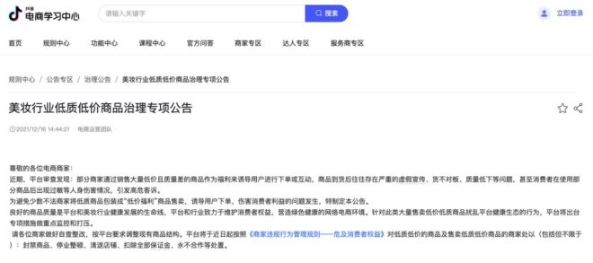 其中明確提到,為避免少數(shù)不法商家將低質(zhì)商品包裝成“低價(jià)福利”商品售賣,誘導(dǎo)用戶下單,傷害消費(fèi)者利益的問題發(fā)生,特制定專項(xiàng)治理公告。
