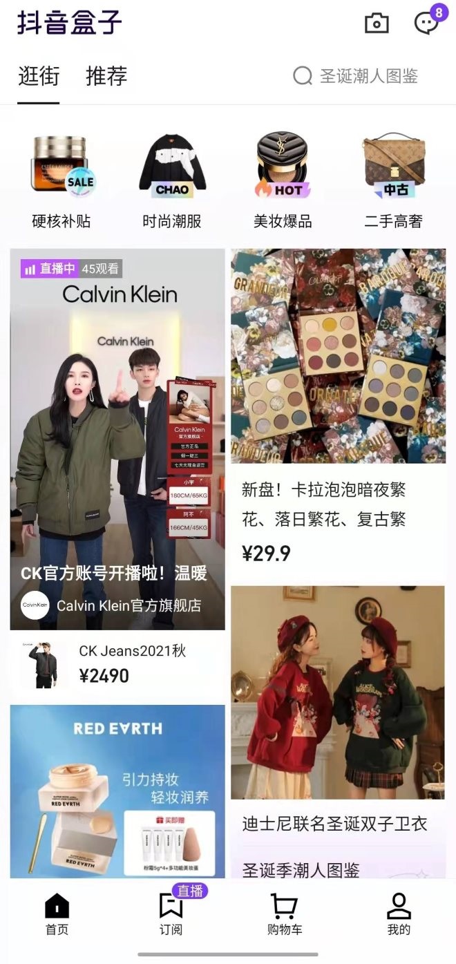 對(duì)于一名有著純粹購(gòu)物需求、強(qiáng)目標(biāo)導(dǎo)向的用戶來(lái)說(shuō),抖音盒子的產(chǎn)品功能弱化了搜索和分類,可能會(huì)顯得雜亂。首頁(yè)提供有逛街、推薦、搜索潮流好物、訂閱、購(gòu)物車等功能入口,用戶可刷到各種關(guān)于穿搭、潮品的視頻,用戶自己也可以上傳短視頻并且開啟直播。