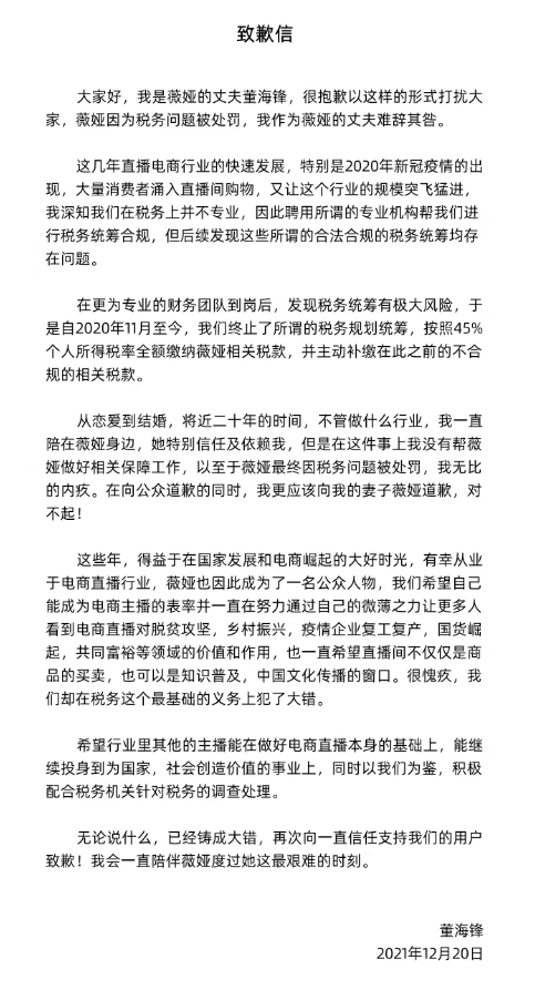 12月20日晚間,薇婭丈夫董海鋒發(fā)布致歉信,信中表示:我深知我們?cè)诙悇?wù)上并不專業(yè),因此聘用所謂的專業(yè)機(jī)構(gòu)幫我們進(jìn)行稅務(wù)統(tǒng)籌合規(guī),但后續(xù)發(fā)現(xiàn)這些所謂的合法合規(guī)的稅務(wù)統(tǒng)籌均存在問題。