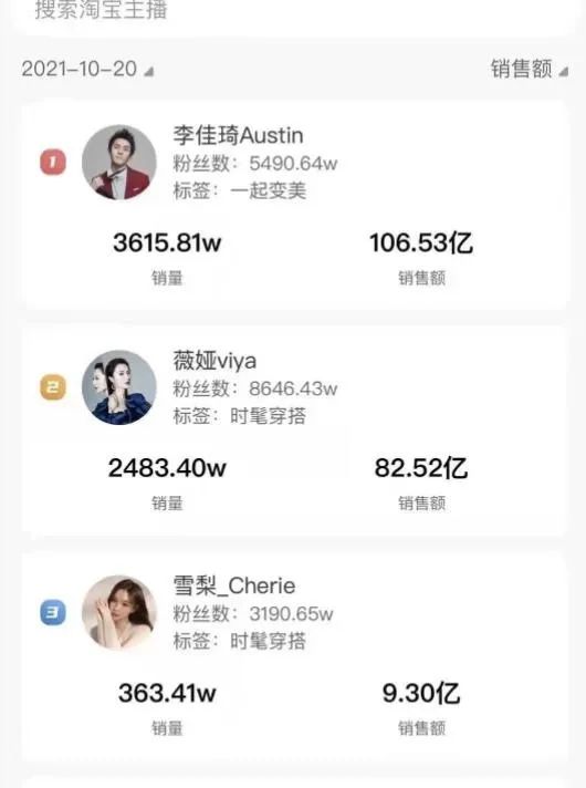在2021年雙11啟動當天,10月21日上午,淘寶主播銷售榜顯示,李佳琦直播最終銷售額達到106.53億元,薇婭直播銷售額為82.52億元,第三名雪梨直播銷售額僅有9.3億元。