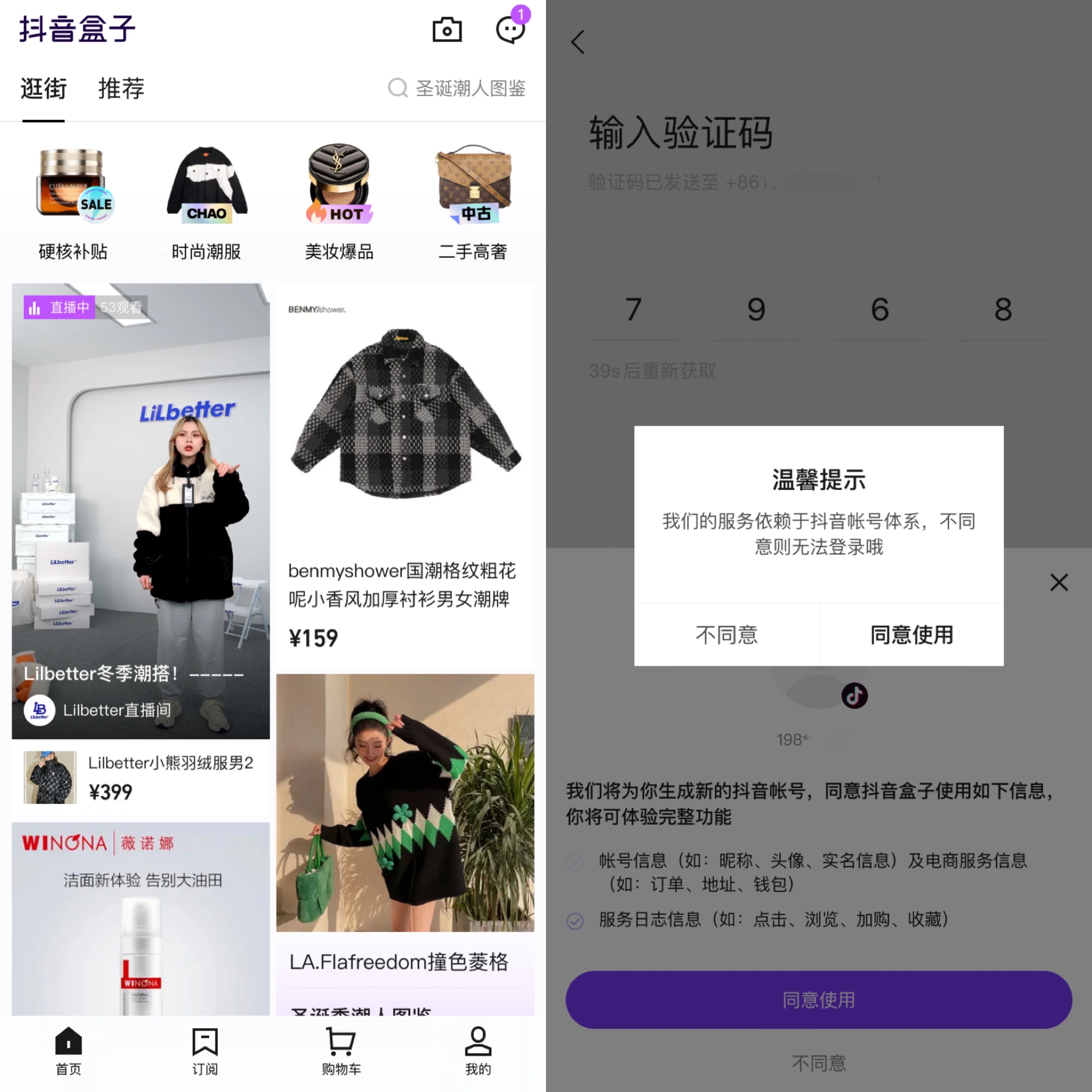 筆者在登陸抖音盒子時(shí)發(fā)現(xiàn),若拒絕提供“服務(wù)日志信息”(如:點(diǎn)擊、瀏覽、加購(gòu)、收藏),則無(wú)法登陸該軟件。官方給出的理由是:“我們的服務(wù)依賴(lài)于抖音賬號(hào)體系,不同意則無(wú)法登陸哦”。