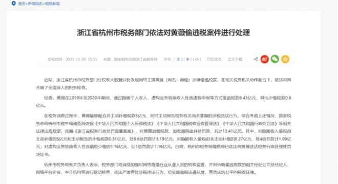 12月20日,浙江省杭州市稅務局消息,頭部電商主播黃薇(薇婭)在2019年到2020年期間,偷逃稅款達6.43億元,少繳納稅款0.6億元,依法對黃薇作出稅務行政處理處罰決定,追繳稅款、加收滯納金并處罰款共計13.41億元。