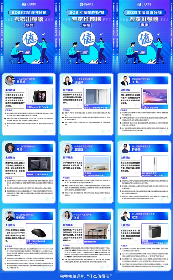 在鼓勵用戶分享每一種值的同時,對于那些決策鏈路較為復(fù)雜的商品,什么值得買則背靠專業(yè)編輯團隊深耕行業(yè)多年的知識積累,結(jié)合大數(shù)據(jù)優(yōu)勢,從用戶實際需求場景出發(fā),通過專業(yè)的推薦和答疑為他們提供決策支持。2021年雙11期間,什么值得買站內(nèi)專業(yè)編輯已組成六大行業(yè)專家天團正式出道,而在此次的“2021年度值得好物榜”當中,18位專家推薦了來自數(shù)碼、母嬰、家電、家居、食品、時尚六大品類的18件硬核好物,共同打造了“專家推薦榜”。