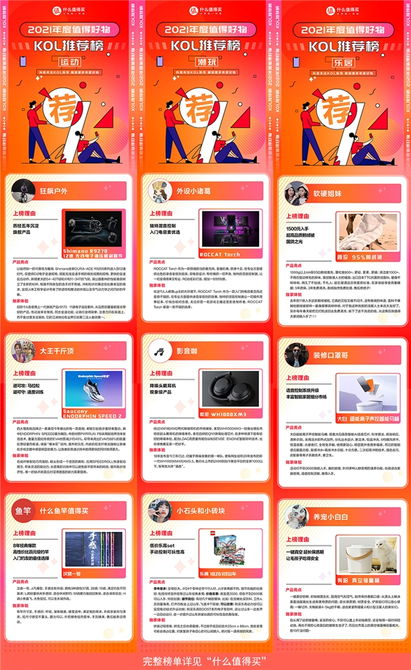 而在什么值得買站外,由什么值得買孵化的KOL,則致力于通過長圖文、短視頻、直播等多元內(nèi)容形式,在抖音、淘寶直播室、B站、微博等全域平臺上,幫助全網(wǎng)消費者不斷提升消費決策的質(zhì)量和效率。什么值得買此次發(fā)布的“2021年度值得好物——KOL推薦榜”,同樣由18位KOL推薦的18件好物構(gòu)成,不過,這份榜單覆蓋了包括“潮玩、樂居、風尚、運動、健康、風味”等在內(nèi)的多個新興細分消費市場,展現(xiàn)了更多的個性化消費特征。