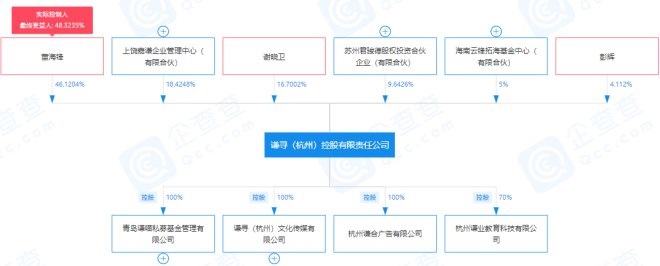 股權關系顯示,謙尋控股實控人為董海鋒,直接持股比例為46.12%。除了董海鋒之外,謙尋控股還有股東上饒嘉謙企業(yè)管理中心(有限合伙)、謝曉衛(wèi)、蘇州君駿德股權投資合伙企業(yè)(有限合伙)、海南云鋒拓;鹬行(有限合伙)、彭輝,分別持股18.42%、16.7%、9.64%、5%、4.11%。