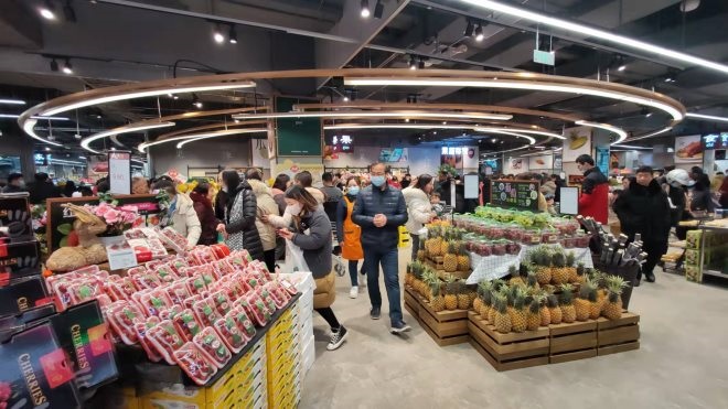 據(jù)悉,新店風(fēng)格構(gòu)思來源清明上河圖對于中國傳統(tǒng)市井生活場景的描畫。門店圍繞“一日三餐”和“居家生活”進(jìn)行布局,中心區(qū)域是代表“一日三餐”的生鮮,周邊圍繞著家居、食品等品類。門店采用大量弧形、島柜、高低錯(cuò)落的設(shè)計(jì)與組合,視野通透,一覽無余。通道寬敞可容多輛購物車同時(shí)通過。營造出濃郁的“市集”氛圍。