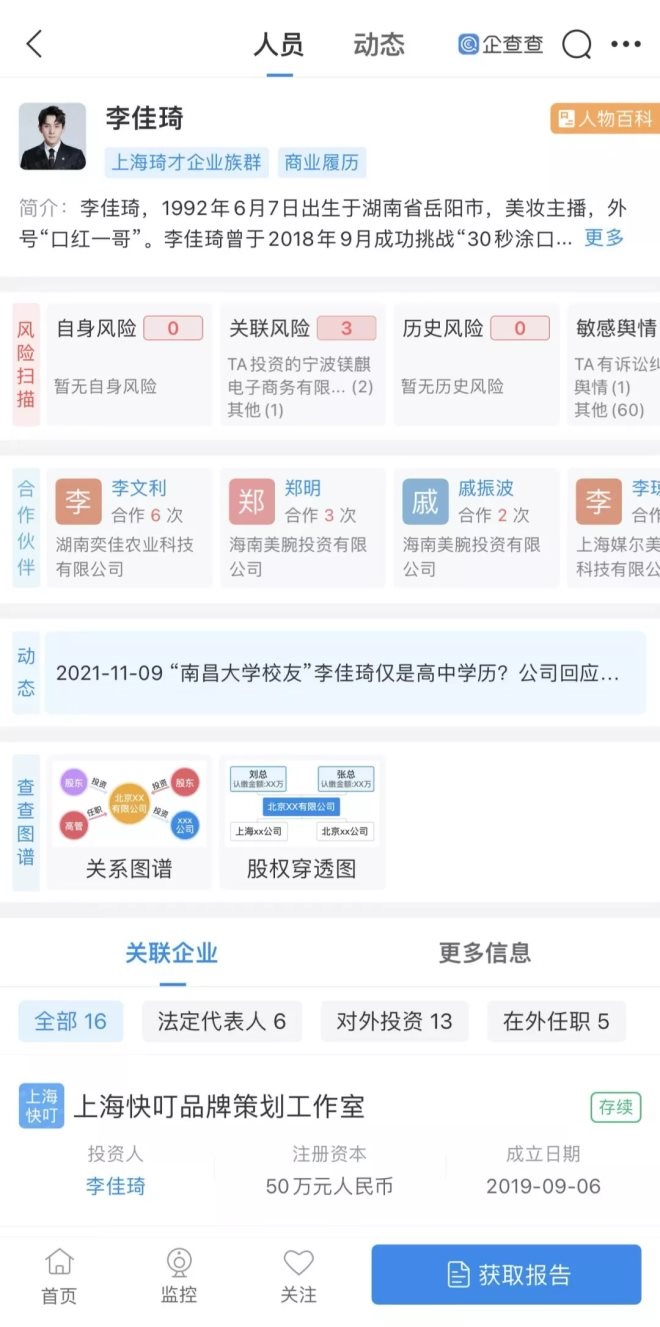 企查查顯示,李佳琦當(dāng)前一共關(guān)聯(lián)了16家企業(yè),其中在六家企業(yè)中擔(dān)任法定代表人,控制企業(yè)數(shù)量達(dá)到13家。