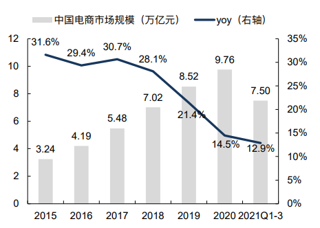 國內(nèi)電商行業(yè)已經(jīng)進(jìn)入成熟期,市場規(guī)模增速呈現(xiàn)放緩態(tài)勢。2018年及以前年增速尚在30%左右,但到了2020年網(wǎng)購人數(shù)達(dá)到7.82億,排除部分偏遠(yuǎn)地區(qū)居民、老年人和嬰幼兒人口后,電商行業(yè)用戶規(guī)模觸近網(wǎng)購目標(biāo)客群規(guī)模的天花板,年增速不足15%。