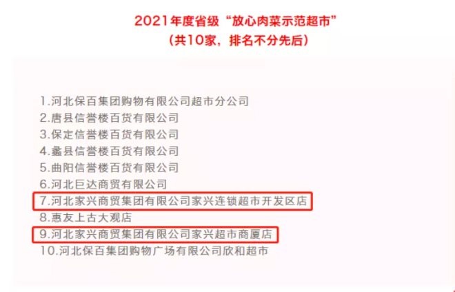 保定市6家超市獲評(píng)市級(jí)2021年度“放心肉菜示范超市”,其中河北家興商貿(mào)集團(tuán)有限公司淶水超市入選!