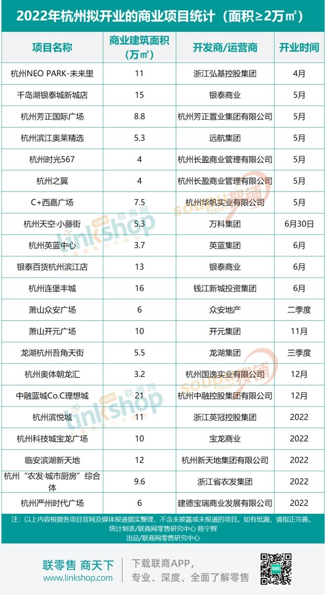 即將到來的2022年,杭州將繼續(xù)保持供應高峰。據(jù)聯(lián)商網(wǎng)零售研究中心統(tǒng)計,2022年杭州計劃開業(yè)的面積在2萬方以上的商業(yè)項目數(shù)量達21家,不含杭州之光·小藤街等2萬方以下的商業(yè)項目。這其中,諸如銀泰百貨杭州濱江店、龍湖杭州吾角天街、杭州天空·小藤街、杭州科技城寶龍廣場等項目備受期待。