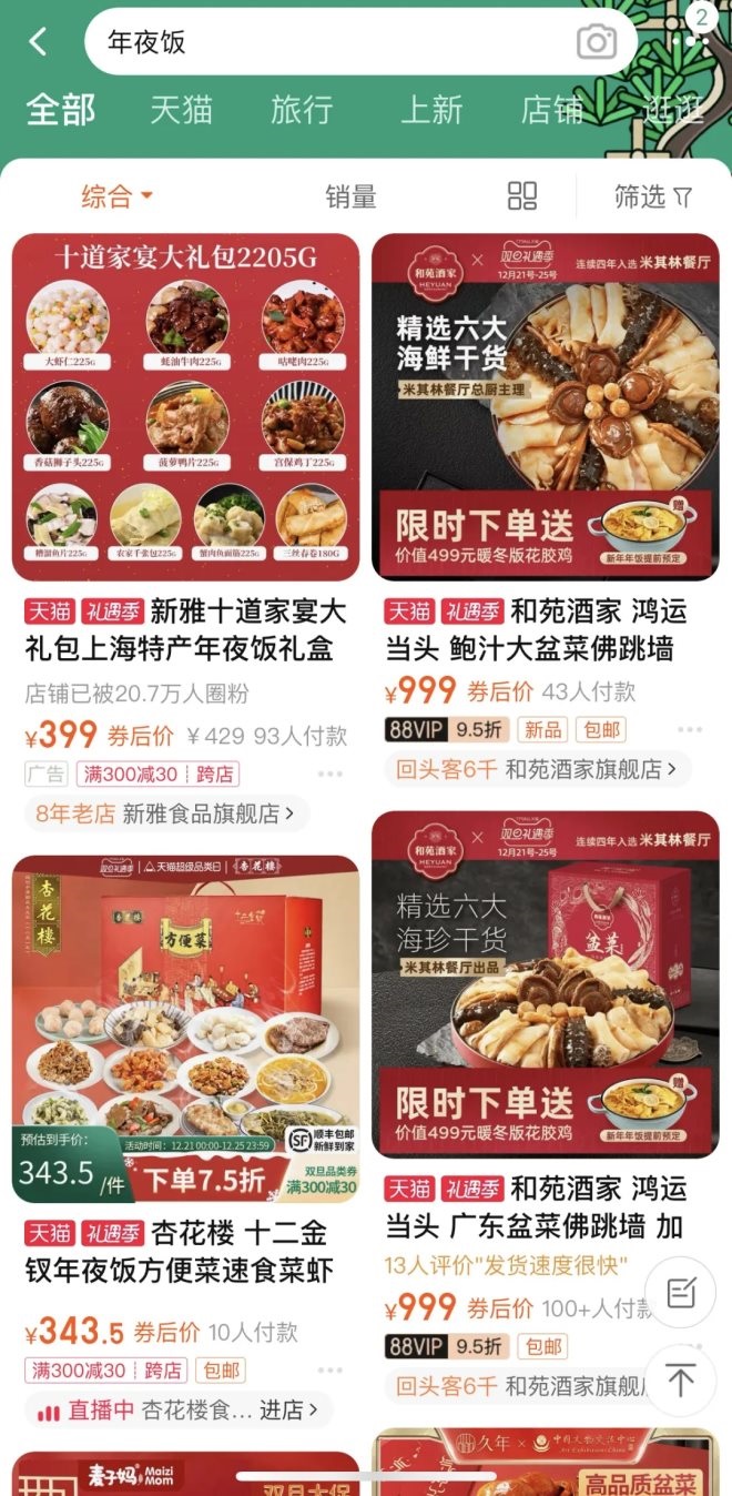 電商平臺也成了年夜飯的另一個陣地,在天貓搜索年夜飯,會有各色商家,其中絕大部分是線下老字號餐飲品牌,也包含麥子媽、日食記等新晉玩家。在線上,年夜飯的概念也在包含傳統(tǒng)套餐之外,延伸到了佛跳墻、甑糕等單品。