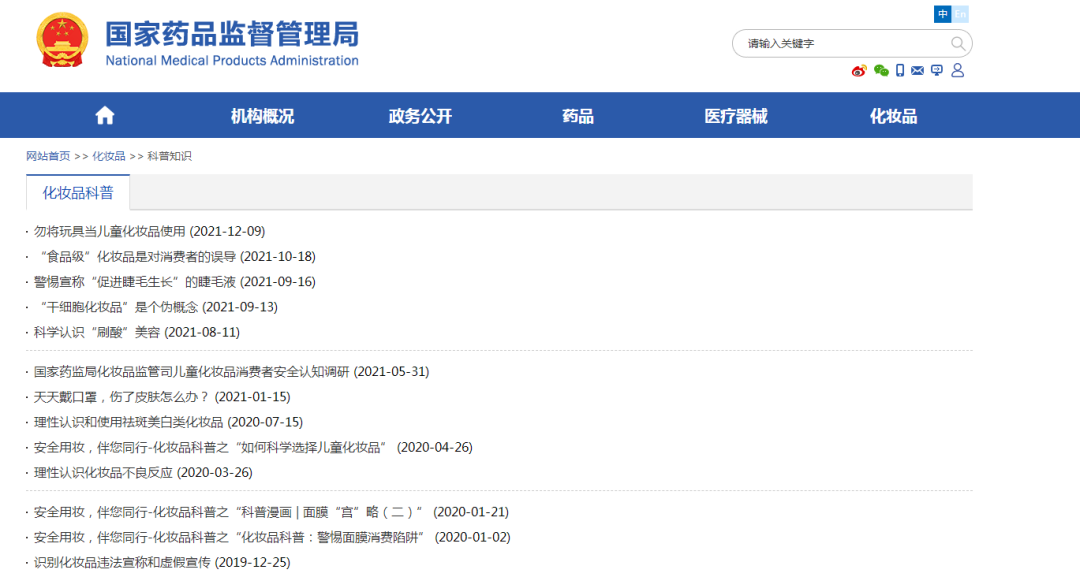 此后,從8月至12月,幾乎平均每個(gè)月國(guó)家藥監(jiān)局都會(huì)通過“科普知識(shí)”欄目發(fā)布1篇與化妝品相關(guān)的科普文章,明確表明國(guó)家對(duì)相關(guān)化妝品的監(jiān)管態(tài)度。