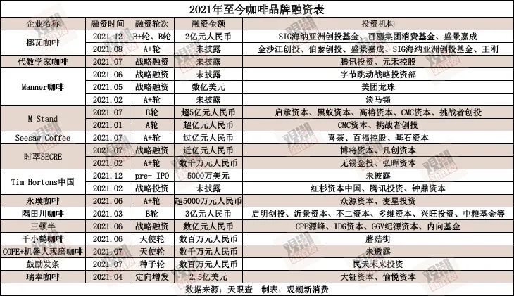 還可以明顯看到,2020年,資本對咖啡市場的關注度主要集中在線上品牌,2021年則是集中在線下連鎖精品咖啡。