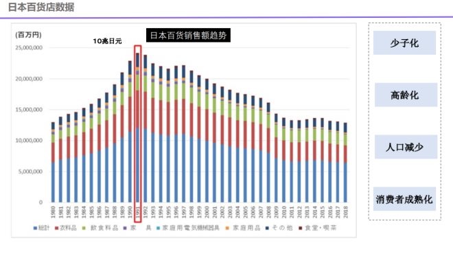 我們大家都聽說過日本的泡沫經(jīng)濟的崩潰,實際上這個泡沫經(jīng)濟崩潰也是在1991年。在1991年的時候日本百貨的營業(yè)達到了10兆日元。那我們看到這個的話它一直實際上在下降。當然下降的原因很多,就像我們右邊所說的,比如說少子化、高齡化、人口減少,在當中最主要的一個原因是人們消費者的已經(jīng)成熟。