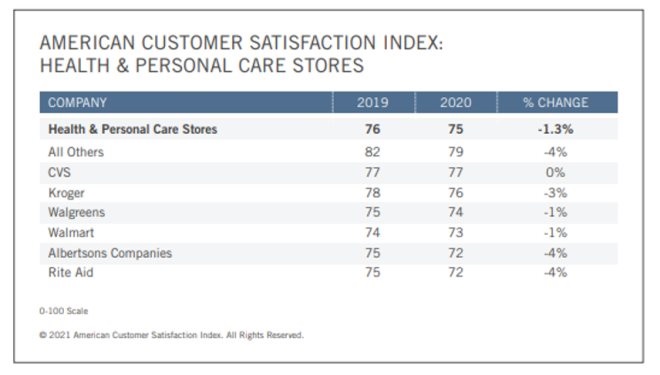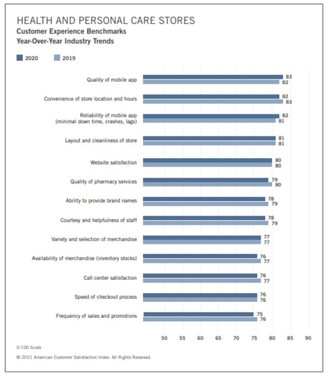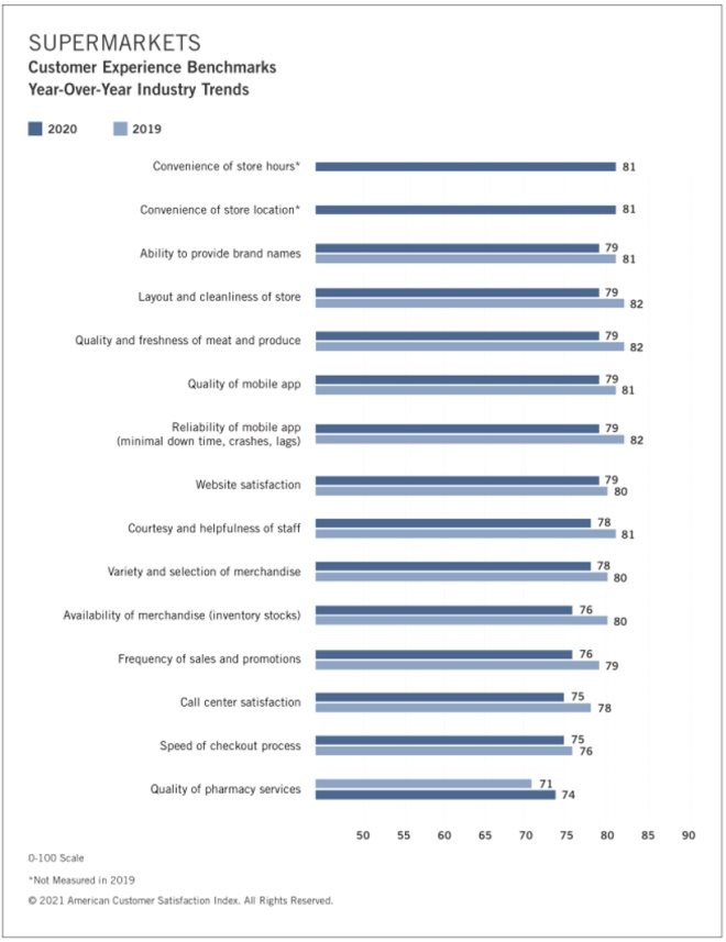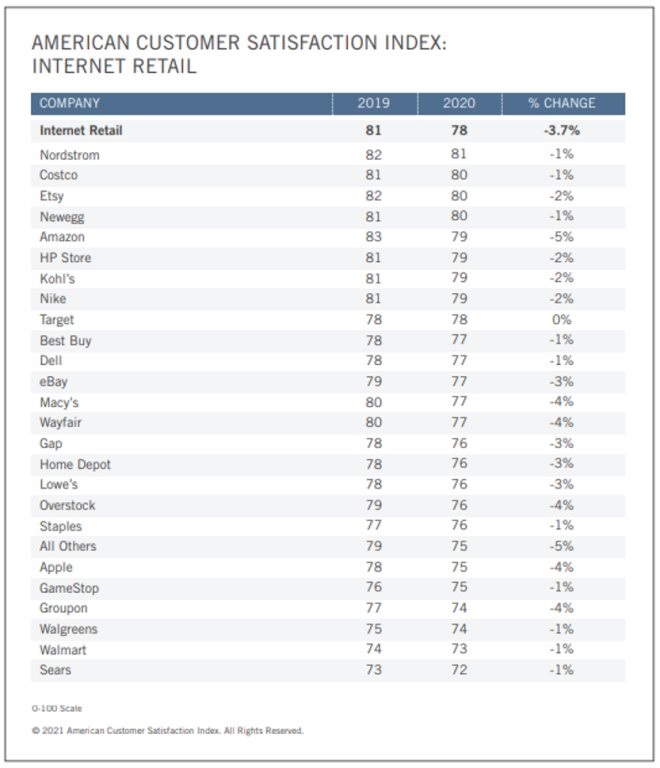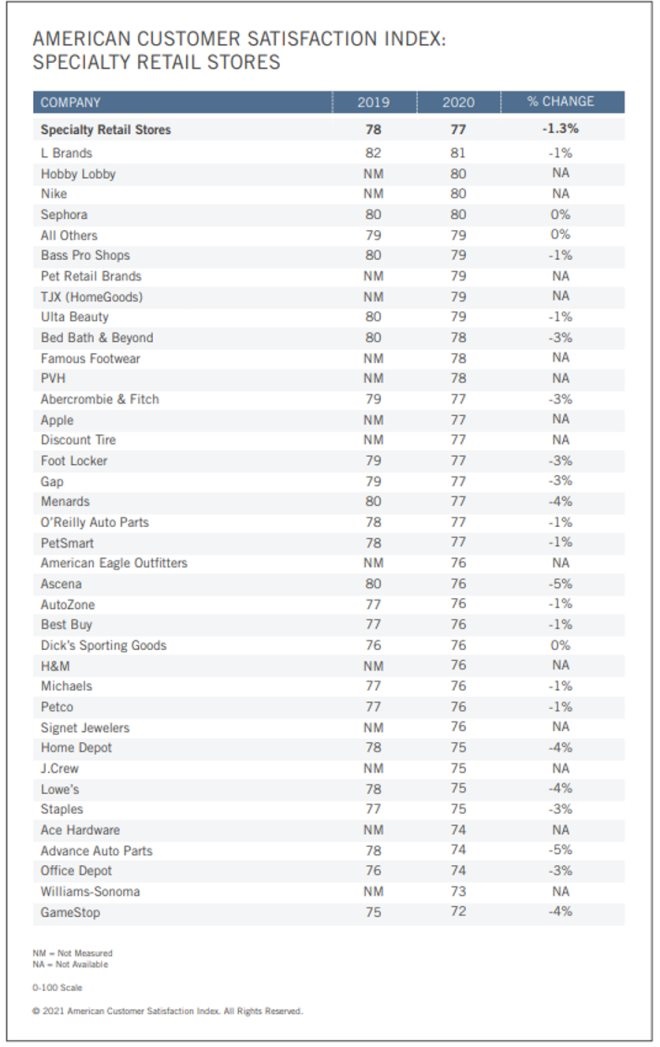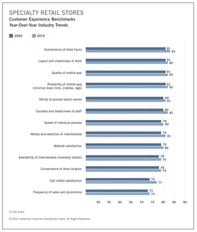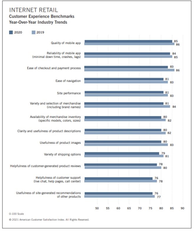 盡管大多數(shù)零售企業(yè)預(yù)計2021年經(jīng)營環(huán)境將發(fā)生改善,但顧客滿意度并沒有朝著期望的方向發(fā)展。根據(jù)美國顧客滿意度指數(shù)(ACSI?),零售行業(yè)整體下滑2.3%為75.5分(總分100)。這是自2015年以來該行業(yè)的最低得分。