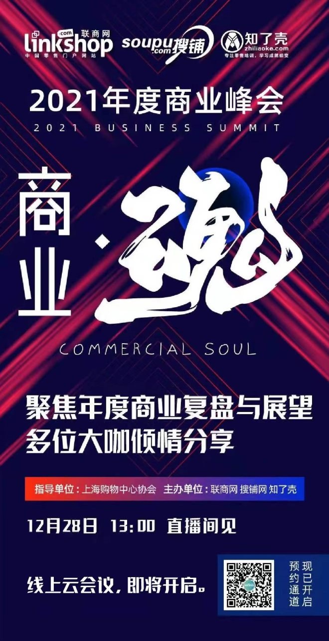 12月28日,由聯(lián)商網(wǎng)、搜鋪網(wǎng)、知了殼共同主辦的2021年度商業(yè)峰會(huì)以云會(huì)議形式如期舉行,本次會(huì)議以“商業(yè)·魂”為主題,邀請(qǐng)了一眾行業(yè)大咖做線上分享,共同探討后疫情時(shí)代,商業(yè)地產(chǎn)運(yùn)營(yíng)如何回歸商業(yè)本質(zhì)的終極命題。