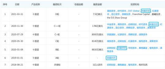 企查查顯示,截至目前,十薈團(tuán)已完成7輪融資,包括阿里巴巴、GGV紀(jì)源資本、時(shí)代資本、中金資本等多家知名機(jī)構(gòu)參與投資,其中阿里參與了包括A輪在內(nèi)的4輪融資。