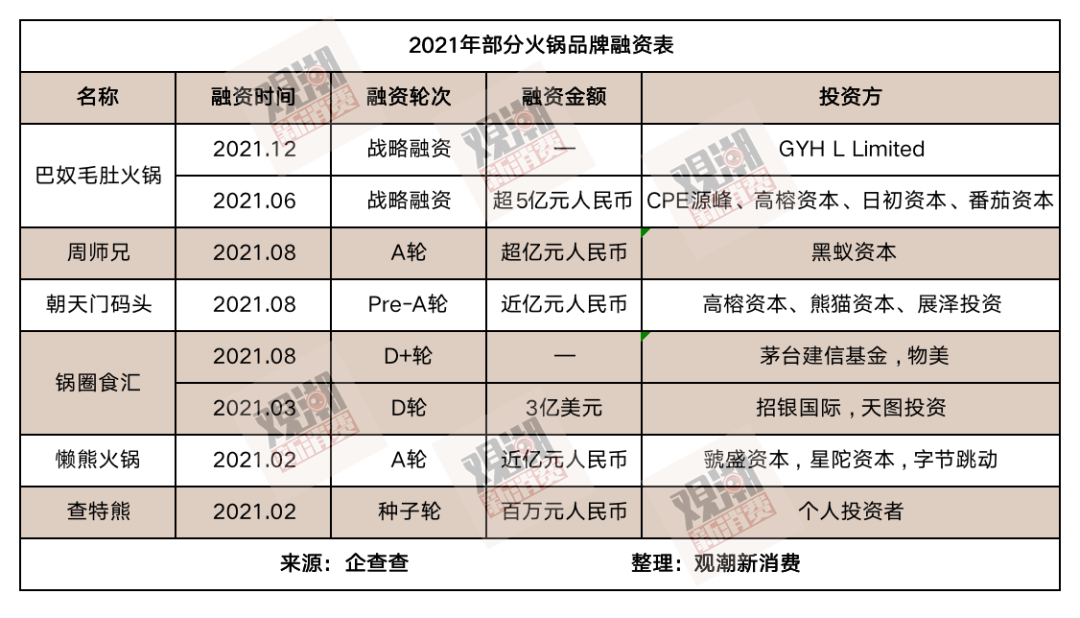 2021年火鍋品牌融資事件不多,但融資金額均上億元;疱伒摹盎稹币踩嫉搅嘶疱伿巢墓⿷(yīng)鏈。鍋圈食匯、懶熊火鍋、查特熊三家從2月至8月共完成了4次融資。