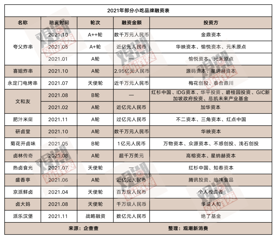 從2021年下半年開始,以烤串、鹵味為代表的小吃品類吸引了大批資本。觀潮新消費(fèi)據(jù)公開數(shù)據(jù)不完全統(tǒng)計(jì),2021年烤串、鹵味等小吃品牌融資事件15起,融資規(guī)模超10億元。
